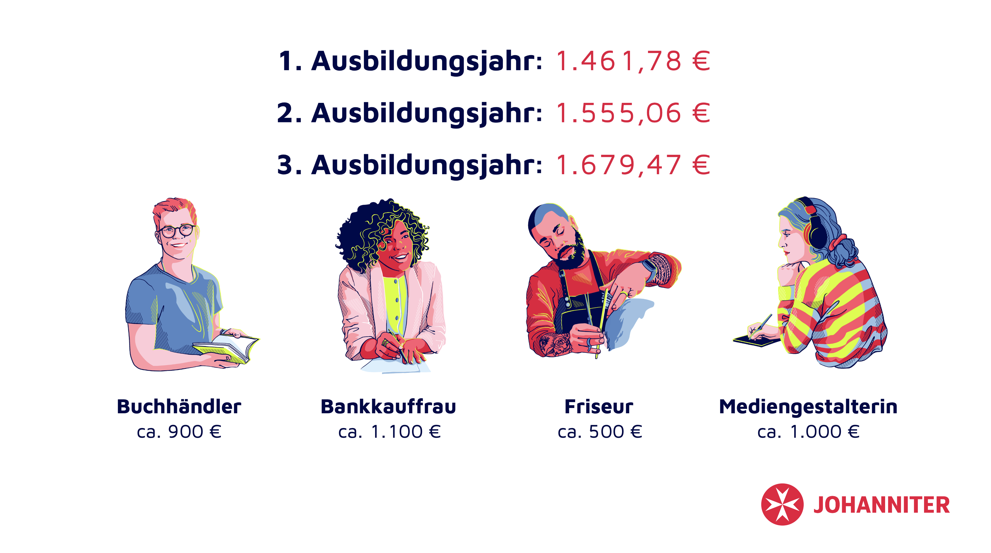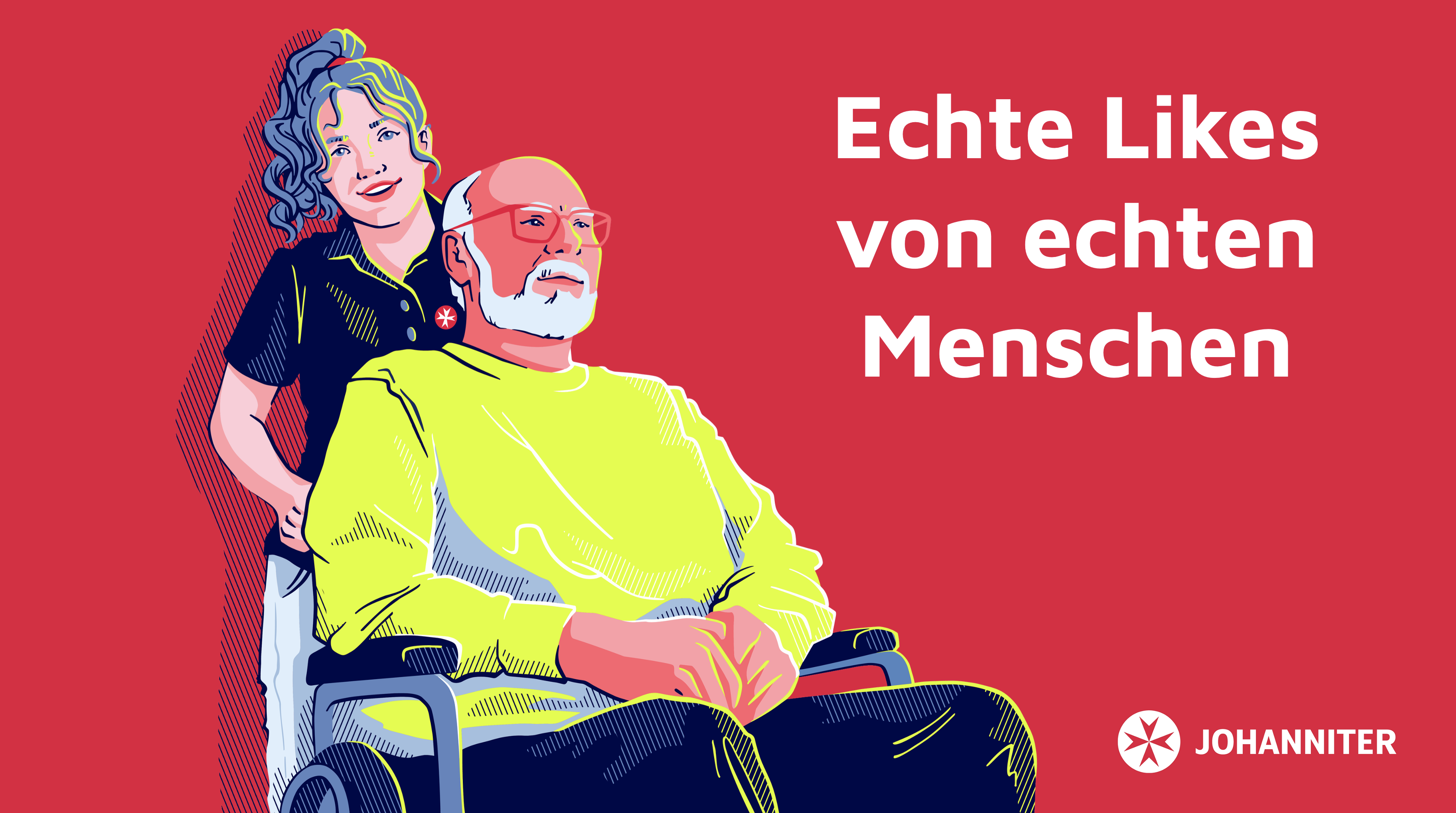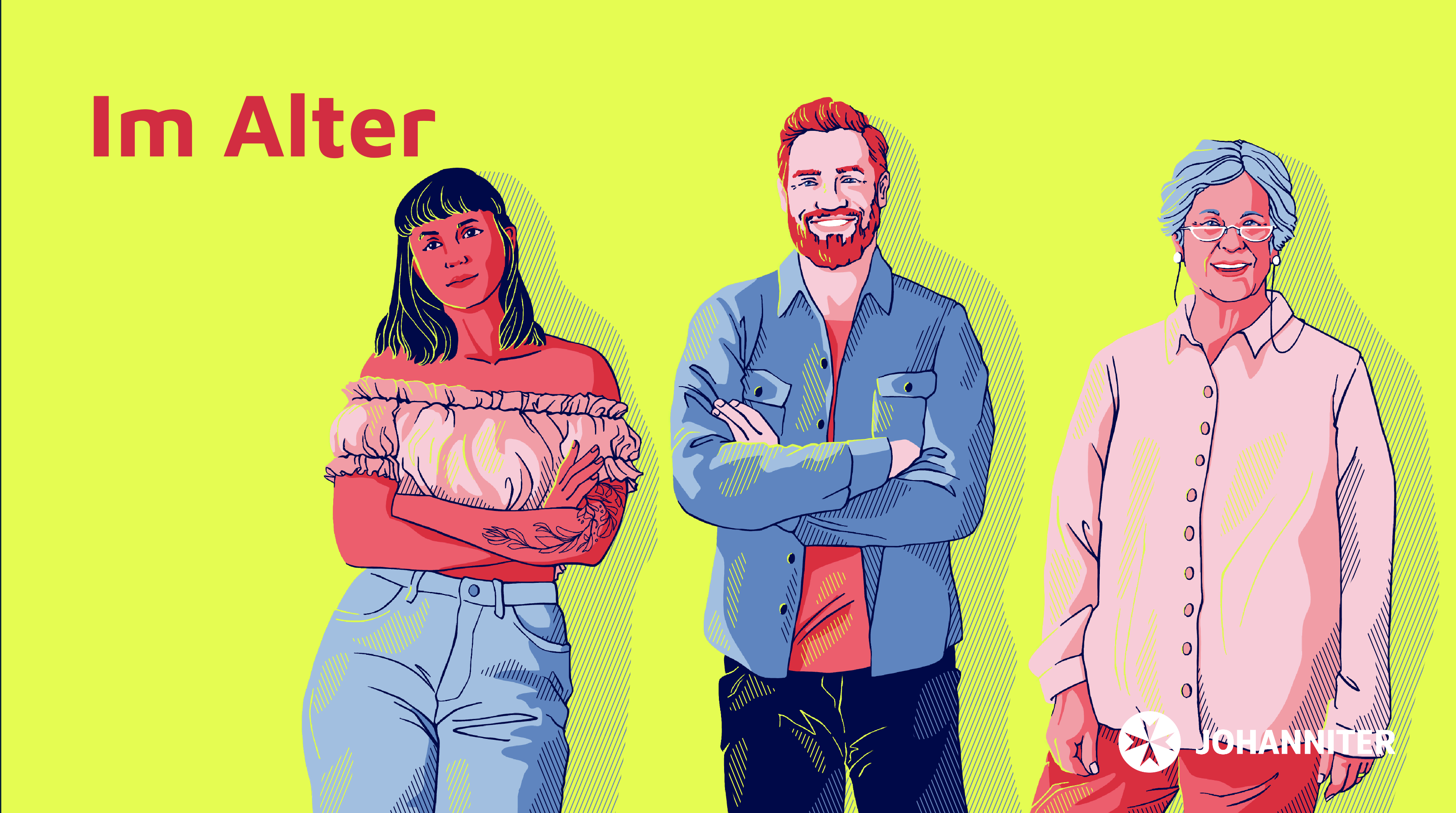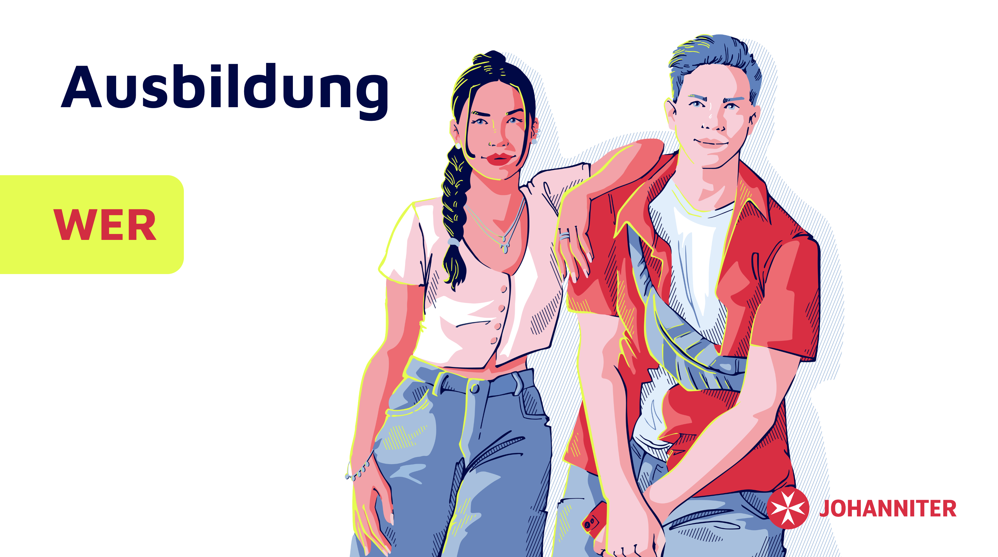 Einige Projekte der Johanniter-Seniorenhäuser habe ich ebefalls illustrativ begleitet. Für eine umfangreiche Kampagne zum Schulmarketing habe ich 2024/2025 den Corporate-Illustrationsstil abgewandelt und an die Zielgruppe angepasst. Die charakteristischen Farben und Schraffuren habe ich beibehalten und mit Details in den Gesichtern und Outline-Elementen mehr Nähe und Persönlichkeit erschaffen.